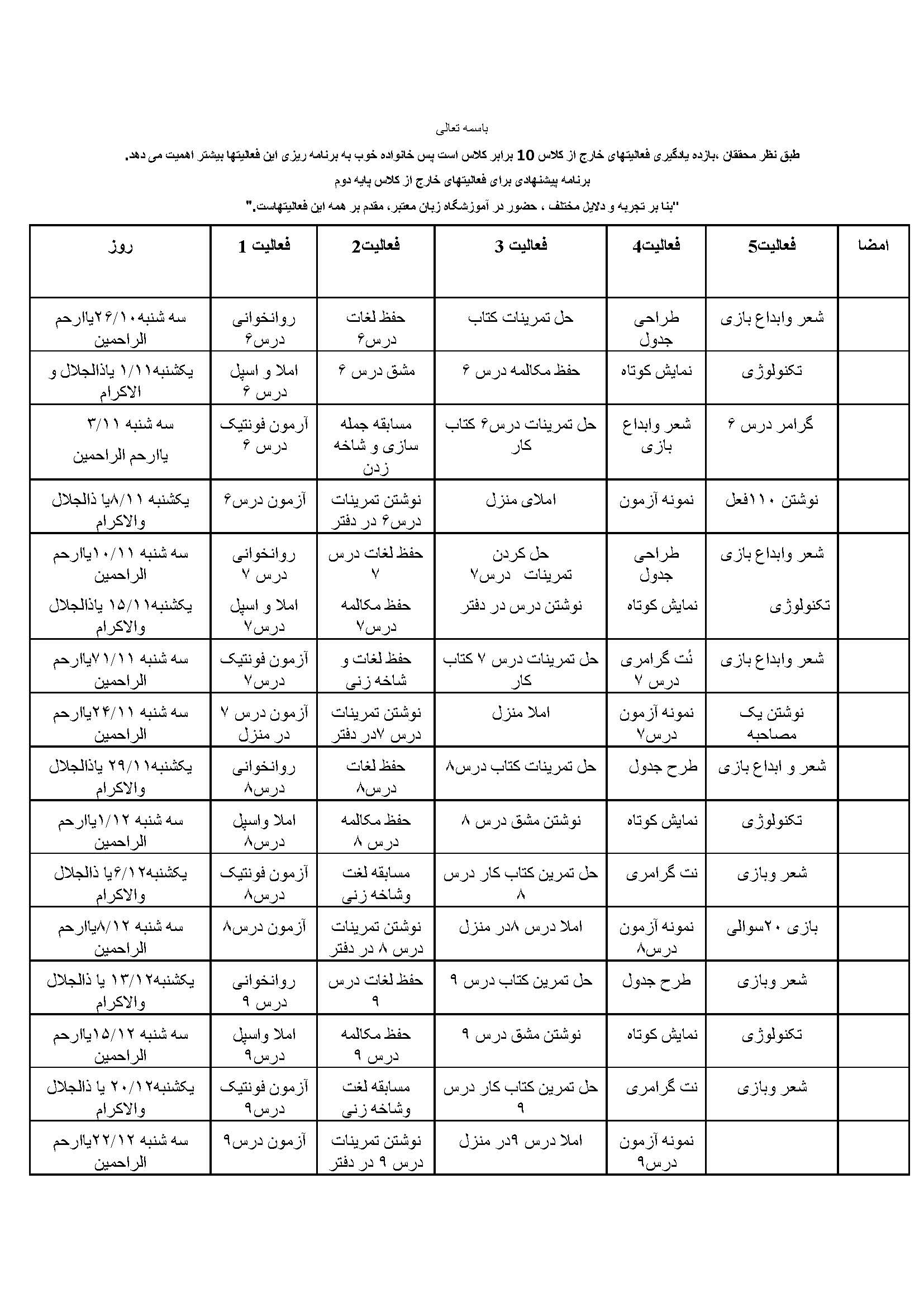 «پایه دوم – مدرسه شهید شعبانی – آبان ماه»
